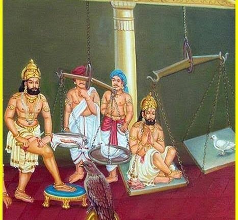 ଏହାକହି ରାଜା ଏକ ତରାଜୁ ଆଣି ଏକ ପଟରେ କପୋତକୁ ବସାଇଲେ ଏବଂ ଅନ୍ୟ ପଟରେ ନିଜ ଶରୀରରୁ ମାଂସ କାଟି ରଖିଲେ l କିନ୍ତୁ ଆଶ୍ଚର୍ଯ୍ୟର କଥା, ଯେତେ ମାଂସ ରଖିଲେ ବି ତାହା କପୋତ ଓଜନ ସହିତ ସମ ତୁଲ ହେଲା ନାହିଁ l ଶେଷରେ ରାଜା ନିଜେ ଯାଇ ତରାଜୁରେ ବସି ପଡ଼ିଲେ l