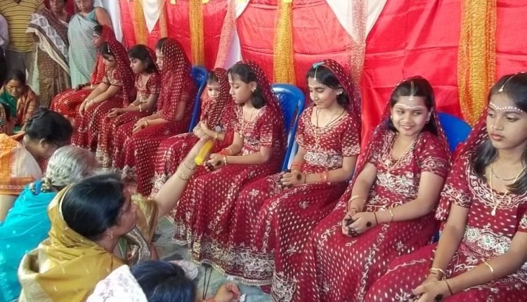 ସାଧାରଣତଃ ଦୁଇବର୍ଷ ବୟସରୁ ଦଶବର୍ଷ ବୟସ ବାଳିକାମାନଙ୍କୁ ଚନ୍ଦନ ଓ କୁଙ୍କୁମରେ ସଜ୍ଜିତକରି, ମୁଣ୍ଡରେ ନାଲି ଓଢ଼ଣା ଦେଇ, ନବବଧୂ ବେଶରେ ସଜ୍ଜିତ କରା ଯାଏ l ପାଦ୍ୟ, ଅର୍ଘ୍ୟ ପ୍ରଦାନ ପୂର୍ବକ ନବଦୁର୍ଗା ଭାବେ ତାଙ୍କୁ ବନ୍ଦାପନା କରାଯାଏ l ଏ କୁମାରୀ କନ୍ୟାଗଣ ଯଥାକ୍ରମେ କୁମାରୀ, ତିମୂର୍ତ୍ତି, କଲ୍ୟାଣୀ,କାଳିକା,ଚଣ୍ଡିକା,ଶାମ୍ଭବୀ,ଦୁର୍ଗା,ସୁଭଦ୍ରା ଓ ରୋହିଣୀ ଭାବରେ ଆରାଧିତା ହୁଅନ୍ତି l କଥିତ ହୁଏ,ଏହି ରୂପରେ କୁମାରୀ ମାନଙ୍କୁ ପୂଜନ କଲେ ମନୁଷ୍ୟର ଦୁଃଖ,ଦାରିଦ୍ର୍ୟ ଏବଂ ଶତ୍ରୁନାଶ ହୋଇ ଥାନ୍ତି l ଧନଧାନ୍ୟ ବୃଦ୍ଧି ପାଏ l ରୋଗ ନାଶ ହୁଏ ଏବଂ ସର୍ବ ଐଶ୍ୱର୍ଯ୍ୟ ପ୍ରାପ୍ତି ହୋଇଥାଏ l