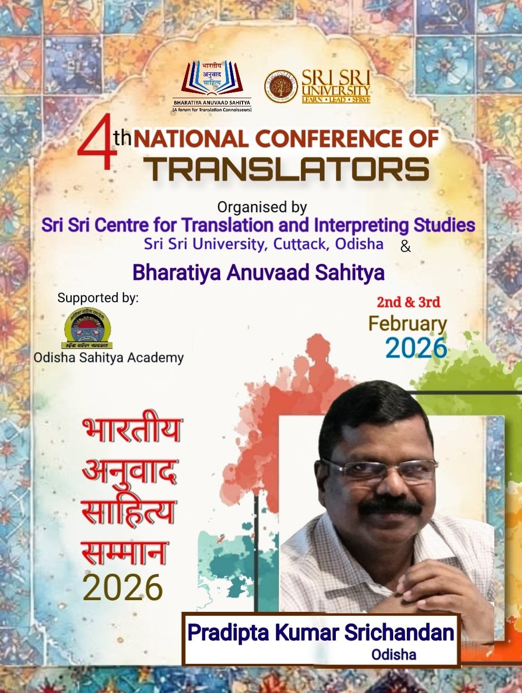 କଟକ (୩୧/୧) : ଆସନ୍ତା ଫେବୃଆରୀ ମାସ ୨ଓ ୩ ତାରିଖରେ ଓଡିଶା ସାହିତ୍ୟ ଏକାଡେମୀର ସହାୟତାରେ ଶ୍ରୀ ଶ୍ରୀ ବିଶ୍ୱବିଦ୍ୟାଳୟର ଶ୍ରୀ ଶ୍ରୀ ସେଣ୍ଟର ଫର୍ ଟ୍ରାନସ୍ ଲେସନ ଆଣ୍ଡ୍ ଇଣ୍ଟରପ୍ରିଟିଙ୍ଗ ଷ୍ଟଡିଜ୍ ଏବଂ ଭାରତୀୟ ଅନୁବାଦ ସାହିତ୍ୟର ସମନ୍ୱୟରେ ପରିଚାଳିତ ୪ର୍ଥ ଜାତୀୟ ଅନୁବାଦକ ସମ୍ମିଳନୀ ଅବସରରେ ବିଶିଷ୍ଟ ଅନୁବାଦକ ଶ୍ରୀ ପ୍ରଦୀପ୍ତ କୁମାର ଶ୍ରୀଚନ୍ଦନଙ୍କୁ ସମ୍ମାନଜନକ ‘ଭାରତୀୟ ଅନୁବାଦ ସାହିତ୍ୟ ସମ୍ମାନ ୨୦୨୬’ ପ୍ରଦାନ କରାଯିବ।